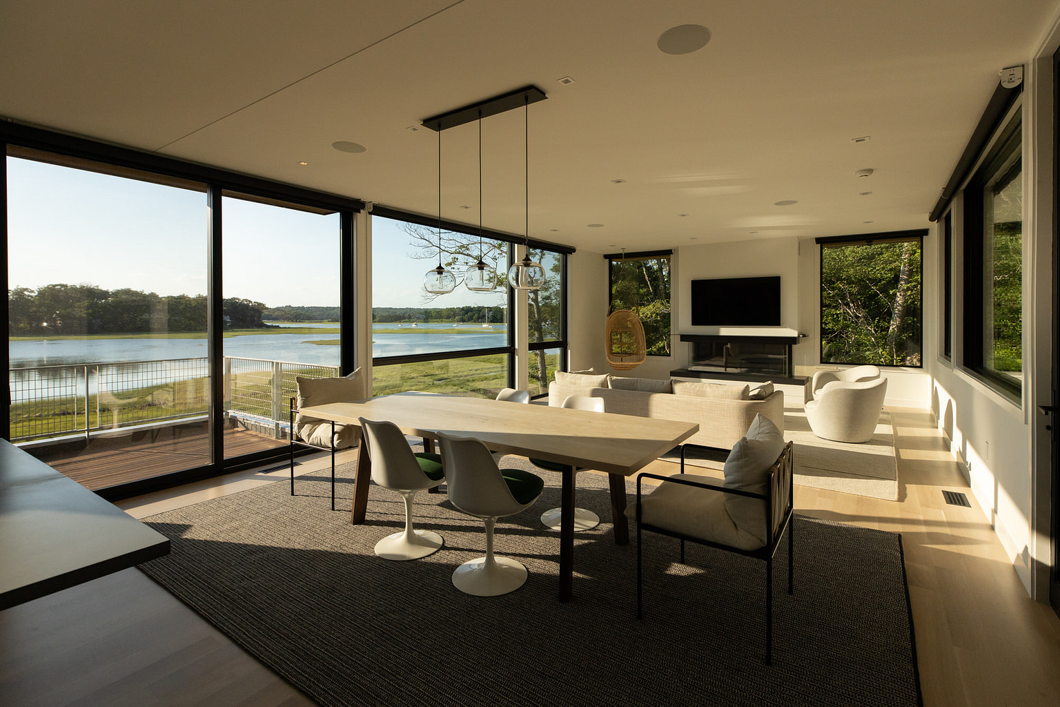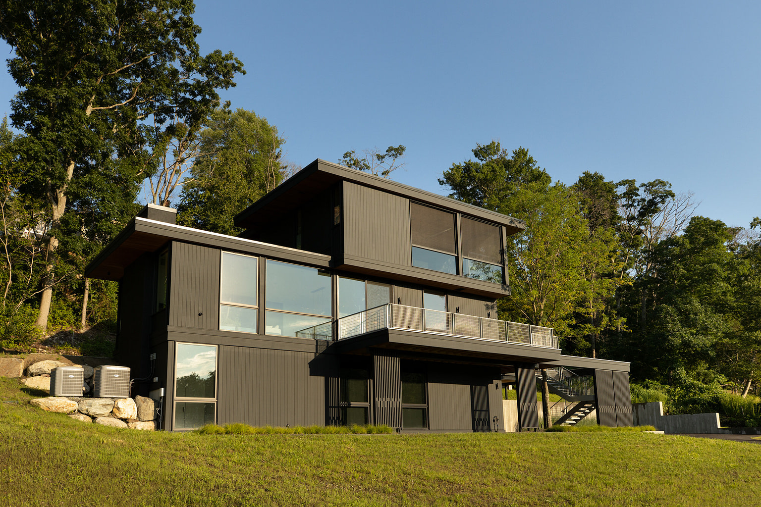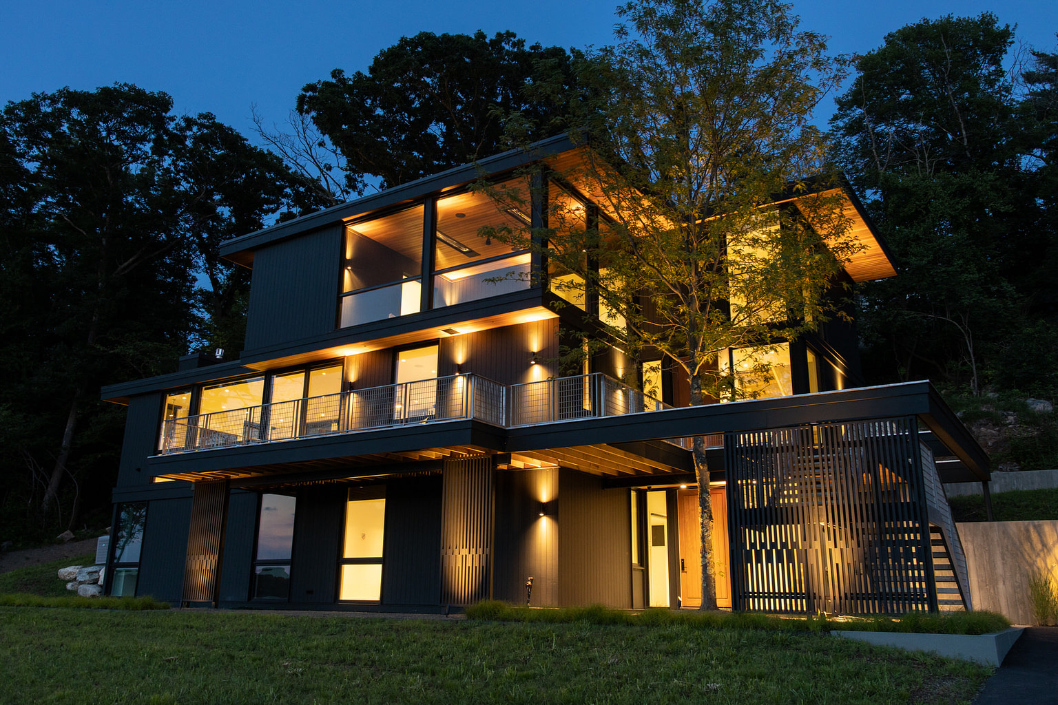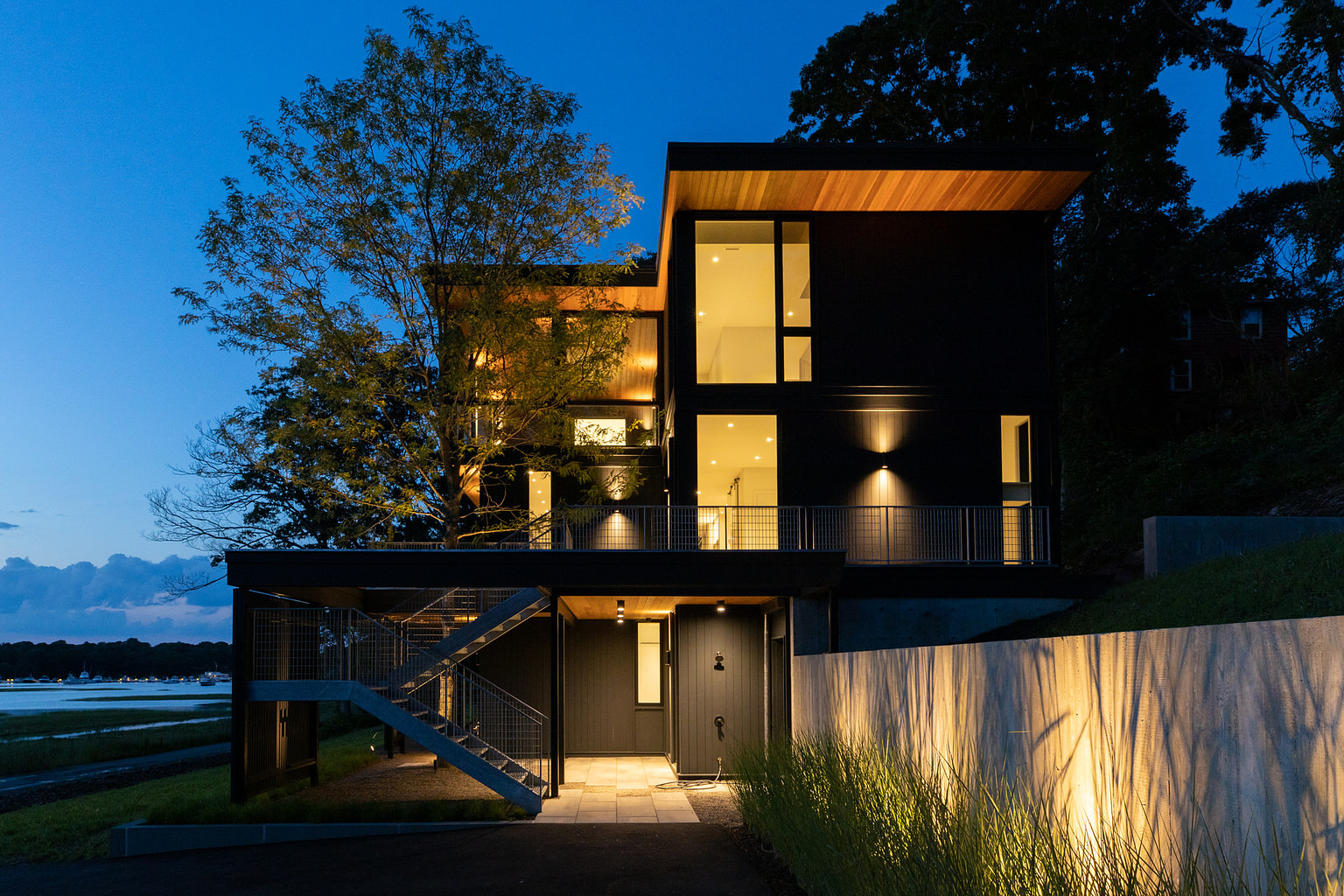 Ground up construction at tidal bay with heavy ledge on sloped terrain. Ledge removal and integration of ledge into structural engineering. Pool infrastructure. Custom metal work at exteriors and interiors. Large format slides and windows. Feature tree extends thought second floor decking.