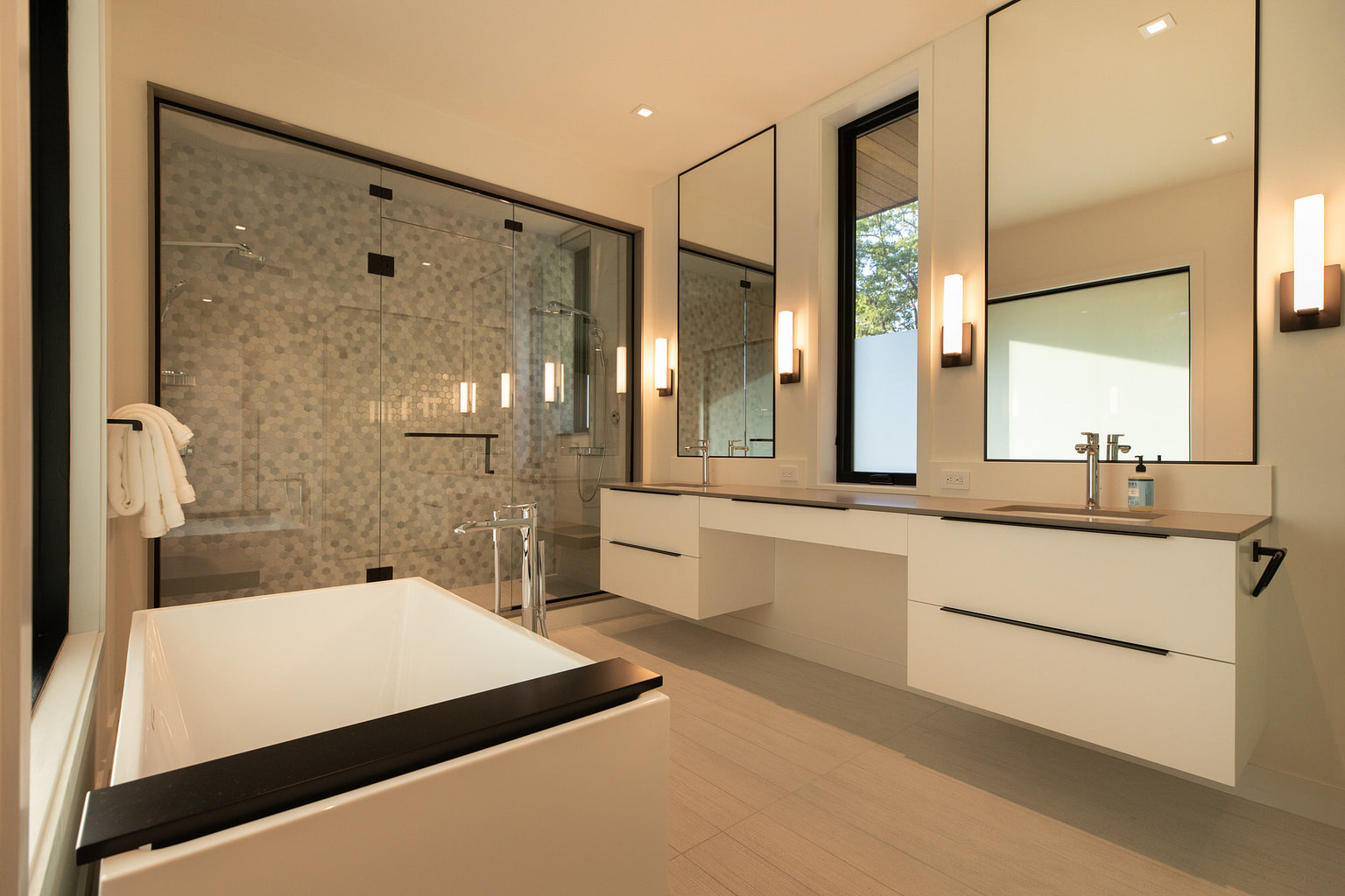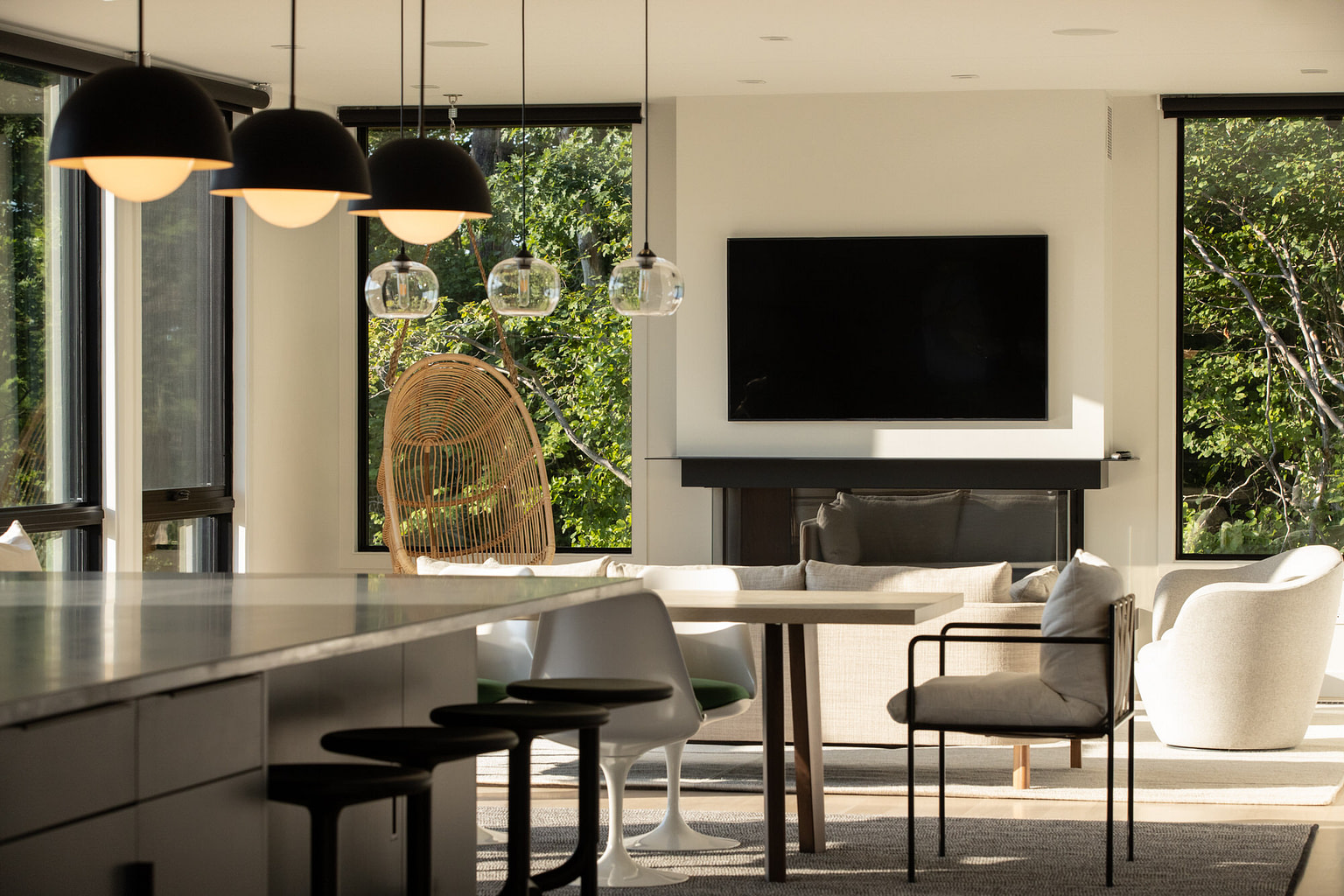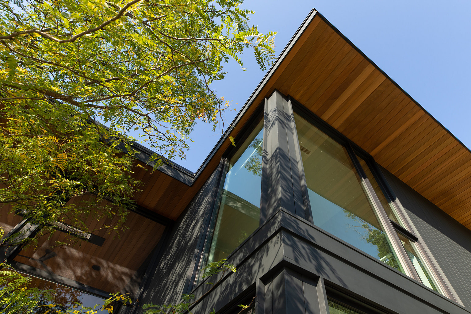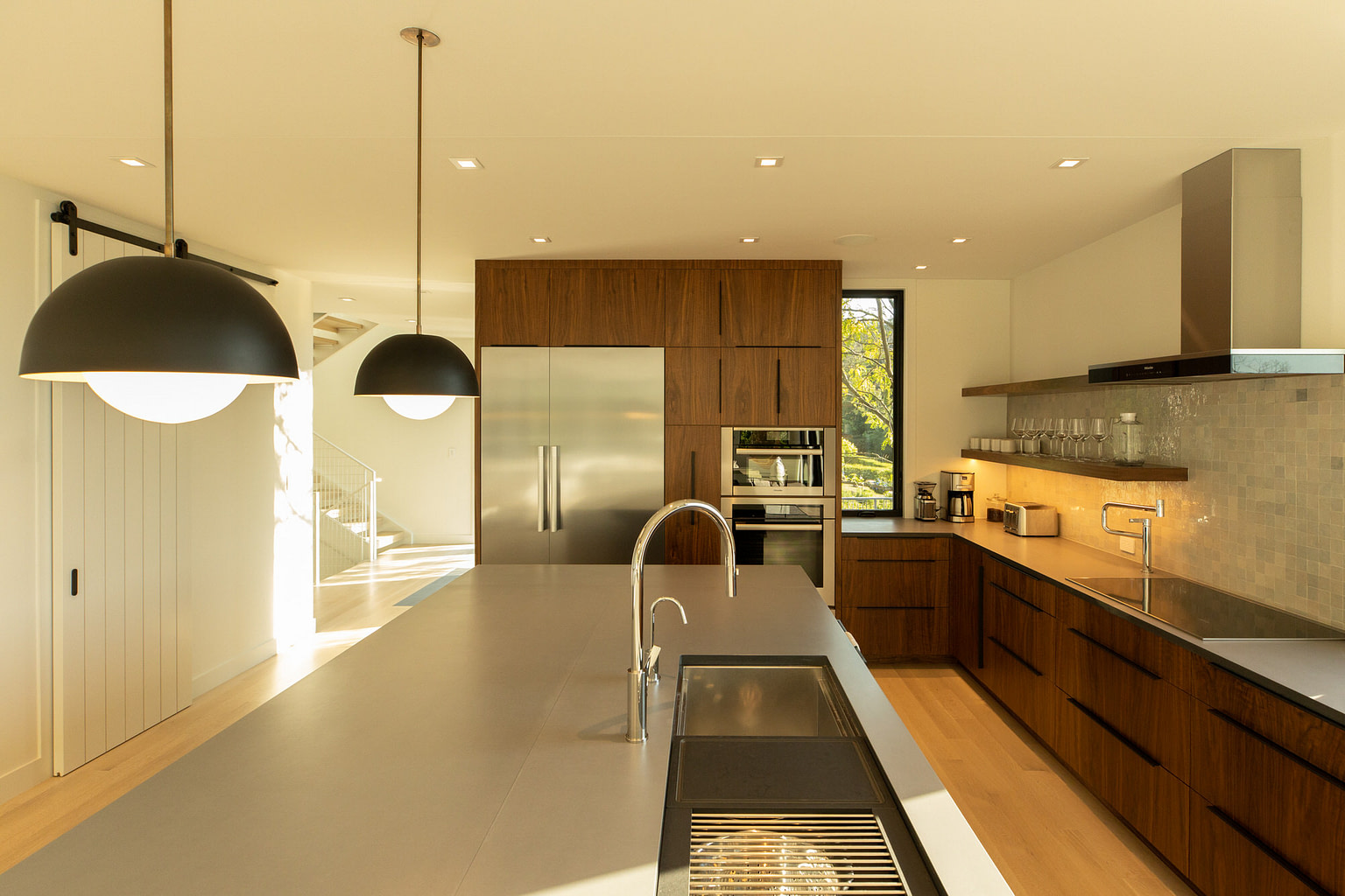 Ground up construction at tidal bay with heavy ledge on sloped terrain. Ledge removal and integration of ledge into structural engineering. Pool infrastructure. Custom metal work at exteriors and interiors. Large format slides and windows. Feature tree extends thought second floor decking.